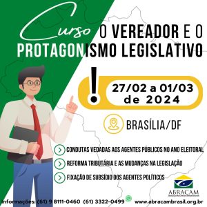 Uma delegação da Câmara Municipal de Santarém está participando em Brasília (DF) do curso “O Vereador e o Protagonismo Legislativo”, promovido pela Associação Brasileira de Câmaras Municipais (ABRACAM). A iniciativa, que acontece de 27 de fevereiro a 1º de março, tem o objetivo de reforçar a ação legislativa dos parlamentares.